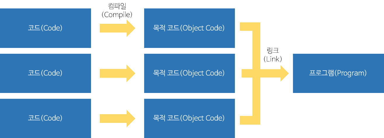 때로는 여러개의 코드를 작성하여 분리하게 되는데, 최종 단계에서 이 코드는 하나의 프로그램으로 완성되게 됩니다.