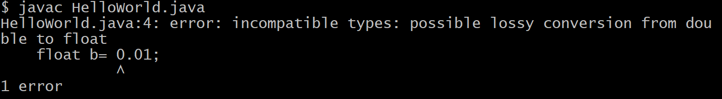 둘째로, 실수입니다. 역시 그냥 0.1234하고 쓰면 됩니다. 여기서 주의할 점은, Java에서는 옆과 같이 쓴 실수는 실수형 자료형의 일종인 double이라는 자료형으로 인식되는데, 이를 더 크기가 작은 float라는 실수형 자료형을 가진 변수에 대입하려 하면, 오류가 나게 됩니다. 이때는 0.1234f와 같이 f또는 F를 붙여줍니다. 즉, float myFloat = 0.1234f;와 같이 초기화 하는 것입니다.
