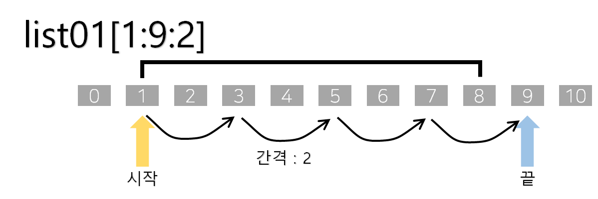 좀더 구체적으로 알아보자면, 콜론(:)으로 구분된 첫번째 숫자는 시작 위치(인덱스), 두번째 숫자는 끝나는 위치로 시작 위치부터 끝나는 위치 바로 전까지의 리스트를 나타냅니다. 세번째 숫자는 간격으로서 몇 칸씩 건너뛰어가며 읽을지를 나타냅니다.