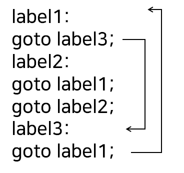 레이블의 이름은 당연히 변수이름처럼 영어대소문자등으로 시작하여 구성해야겠죠? 레이블의 위치는 어디든 상관없으며 콜론(:)으로 마무리해야 합니다. 특히 중첩된 반복문을 탈출하는 경우라면 엄청 단순하고 명료하지만, 남발하는 경우 다음과 같은 치명적인 문제가 있습니다.