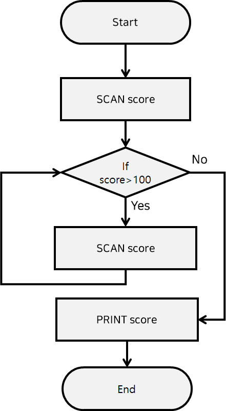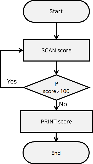 위의 순서도를 보면 알겠지만, scan score 부분이 중복되어 사용되었습니다. C/C++, Java(Python 제외)는 do~while문으로 이 문제를 해결합니다.
