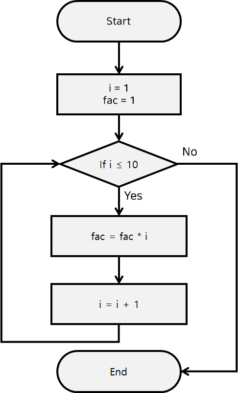 저번 글에서 다룬 비교 연산자 등을 이용해 다음과 같이 코드를 작성해 볼 수 있습니다. 아래 코드는 10 팩토리얼(10!)을 계산하는 예시입니다.