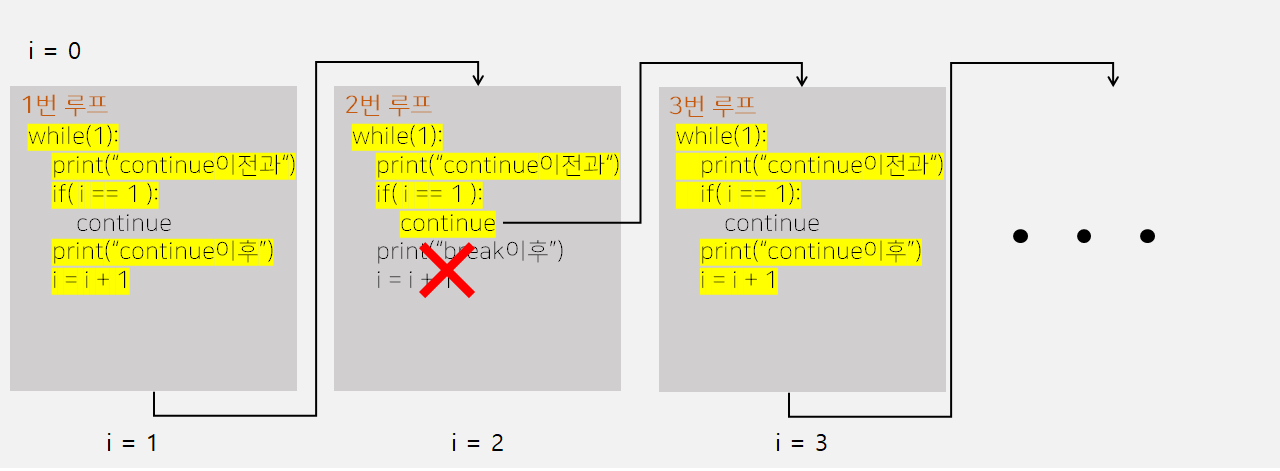 아래는 break문과 continue문이 어떻게 흐름을 조절하는 지 표시해줍니다.