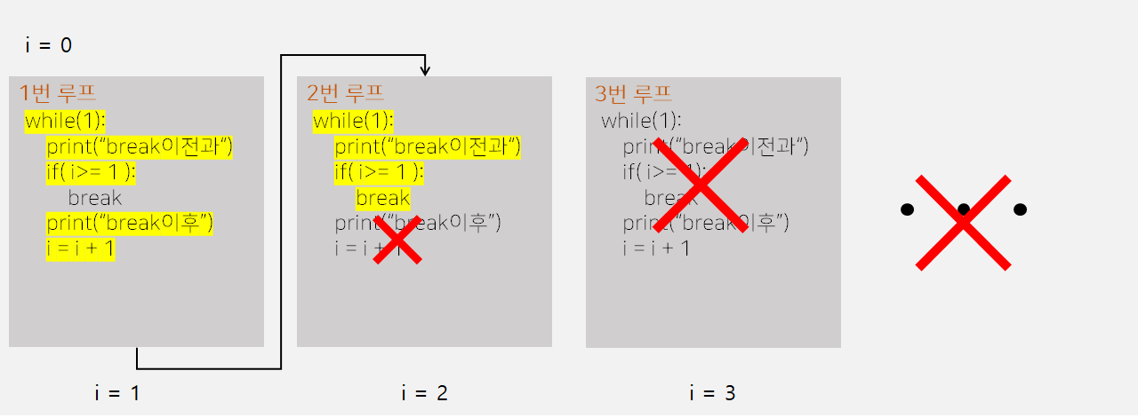 위 예시는 다음과 같은 과정을 거쳐 실행됩니다. ( 형광펜 표시가 된 부분은 실행이 된 부분이며, break문으로 생략된 부분은 X표시로 표시하였습니다. (보기 편하도록 각 루프를 개별적으로 표시하였으며, 그 아래 루프가 종결된 후의 i의 값을 표시해두었습니다.)