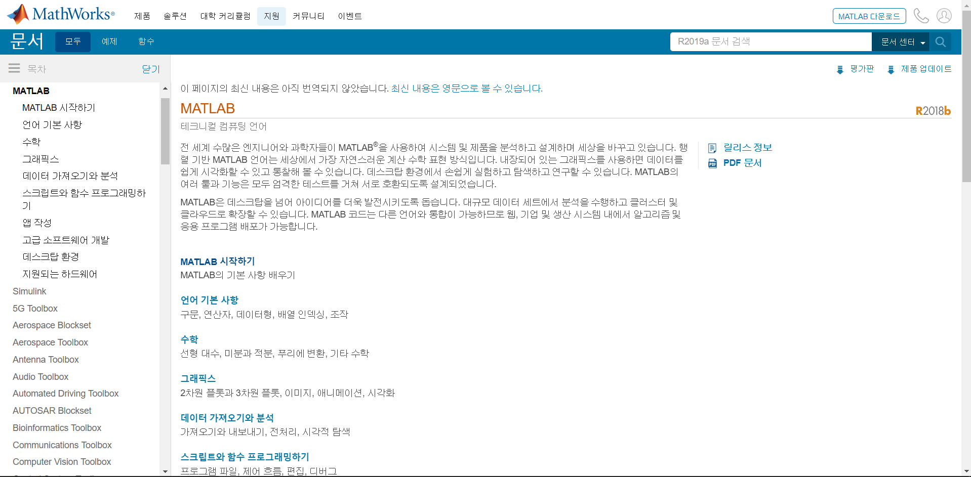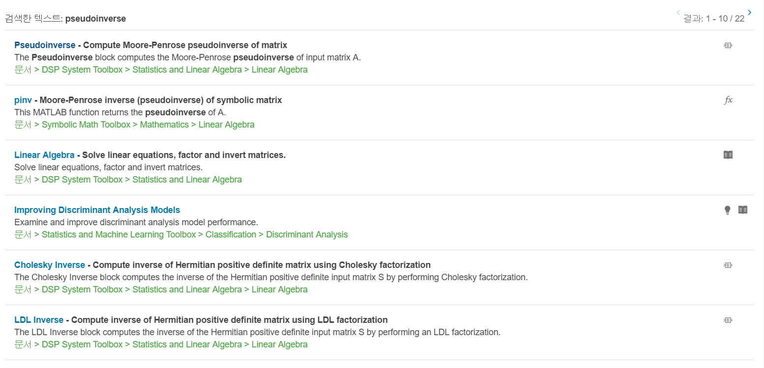 다 영어이긴 하지만, MATLAB을 배우는 정도의 분들이라면 충분히 읽으실 수 있을 겁니다. 위에서부터 차례로 기본 수학 함수들, 좀 더 전문적인 수학 함수들, 기본적인 행렬과 행렬 조작에 관한 함수들을 표시합니다.