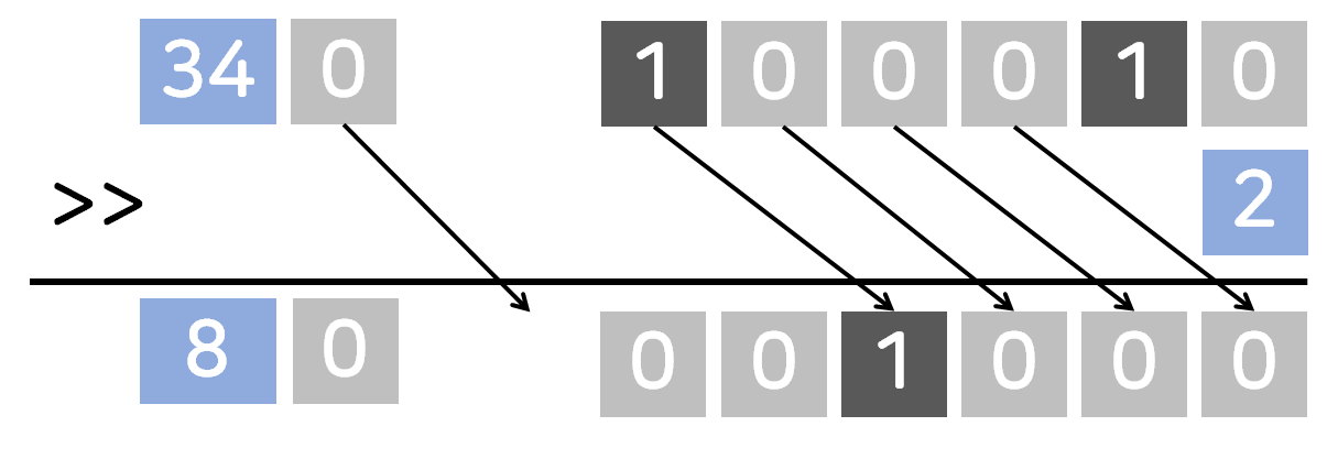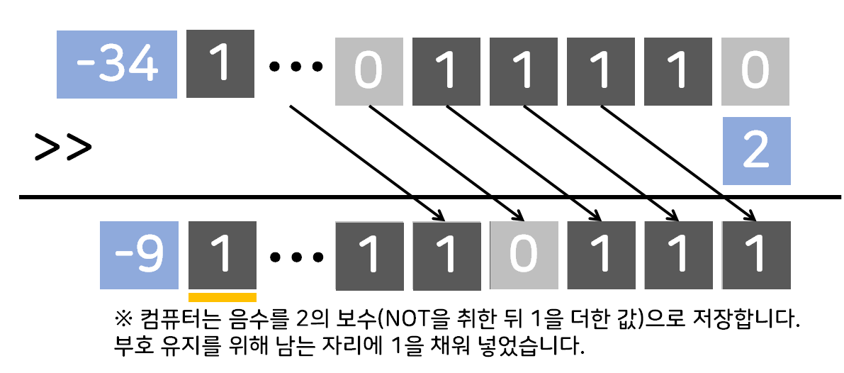 | >> | 오른쪽으로 주어진 칸만큼 비트 이동(오른쪽에 주어진 칸을 쓰며 10진수로 표기) (넘어가는 부분은 삭제, 부호 유지(≥0인 수와 <0인 수로 나뉨) |
