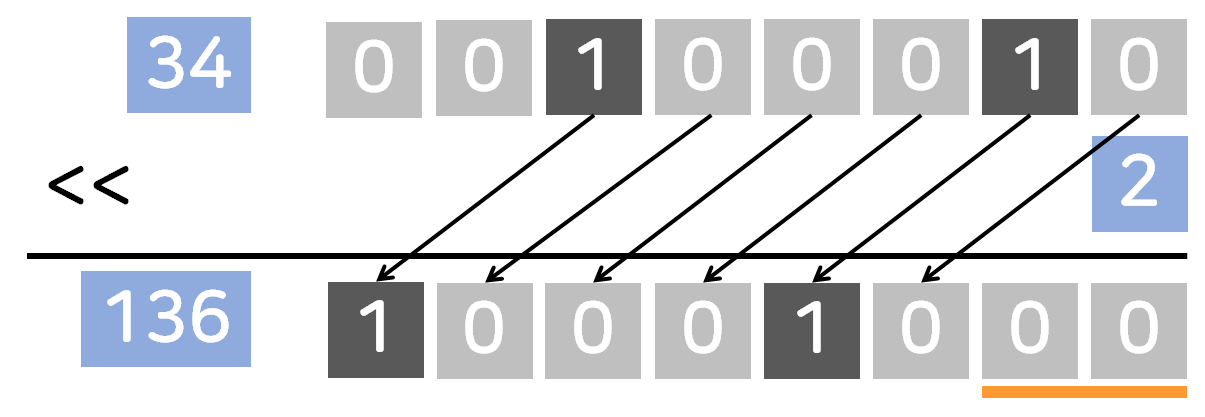 | << | 왼쪽으로 주어진 칸만큼 비트 이동 (넘어가는 부분은 삭제, 부호 유지) |