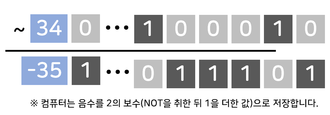 비트 연산자가 나온 김에 컴퓨터의 음수 저장 시스템을 잠깐 살펴보겠습니다. 컴퓨터가 음수를 표현하는 방법은 부호 비트를 할당하는 법, 1의 보수(그냥 보수), 2의 보수(1의 보수를 구하고 1을 더함)을 이용하는 방법 등이 있으며, 2의 보수가 가장 많이 사용됩니다.