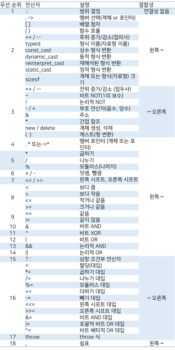 먼저 C++입니다. Microsoft C++ Document를 참고했습니다.(https://docs.microsoft.com/ko-kr/cpp/cpp/cpp-built-in-operators-precedence-and-associativity?view=vs-2019)