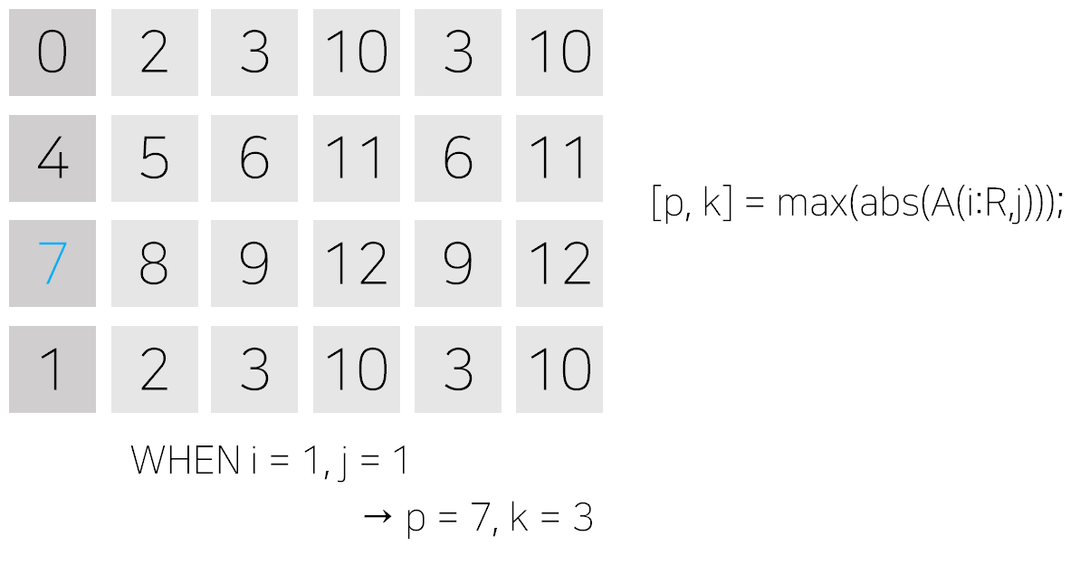 그리고 곧이어 k = k + i - 1로 인덱싱한 작은 행렬의 열벡터에서 구한 인덱스를 전체 행렬 기준으로 바꾸어줍니다.