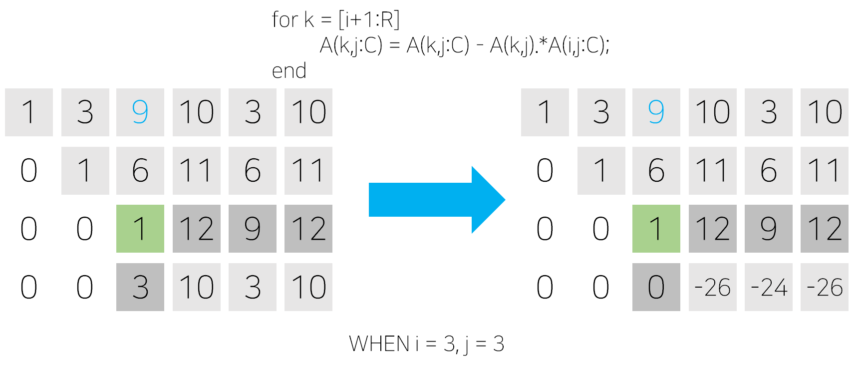 A(k,j:C) = A(k,j:C) - A(k,j).*A(i,j:C);