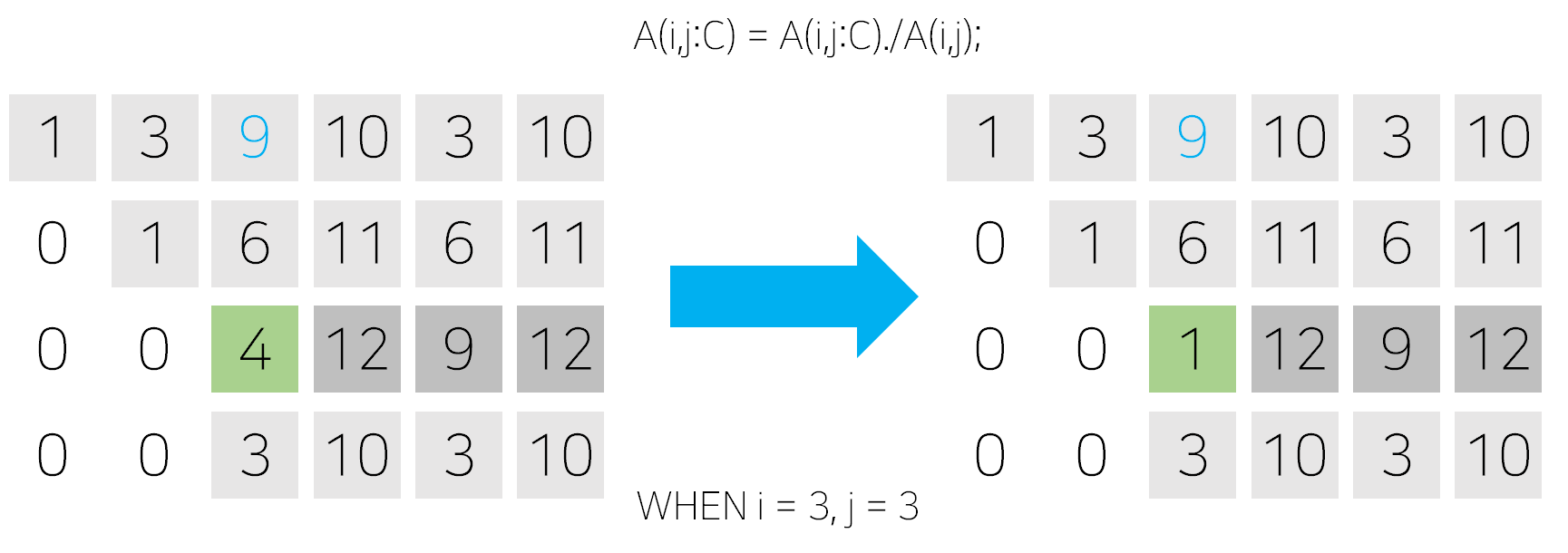 A(i,j:C) = A(i,j:C)./A(i,j);