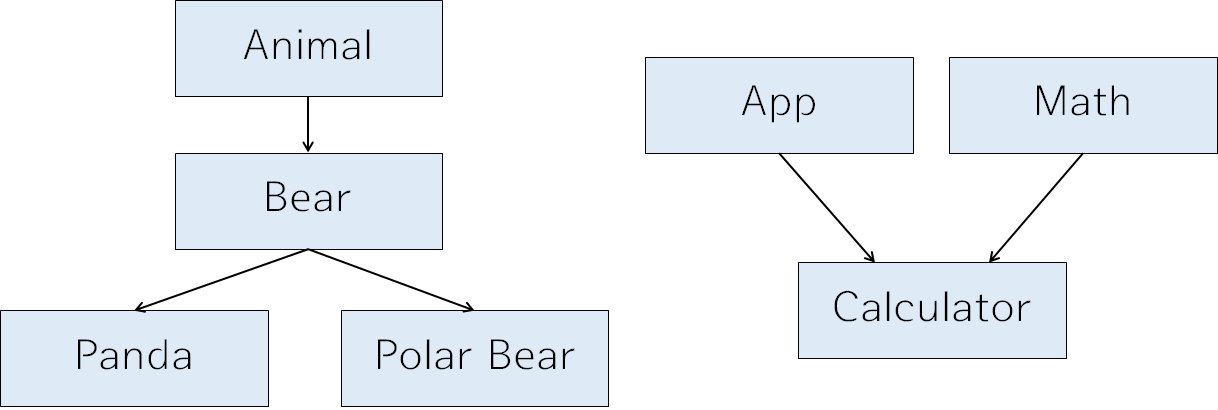 이러한 관계는 한 클래스가 한 클래스 만을 상속받는 왼쪽 그림과 같은 형태일수도 있고, 한 클래스가 여러 클래스를 상속받는 형태일수도 있습니다. 다만, 오른쪽과 같은 여러 클래스를 상속하는 경우는 C++, Python에서 가능하지만, Java에서는 불가능합니다. (오른쪽과 같은 경우 에러가 발생하는 경우 찾기도 힘들고, 그런 경우가 많기에 Java에서는 자체적으로 지원하지 않는 것 같습니다.)