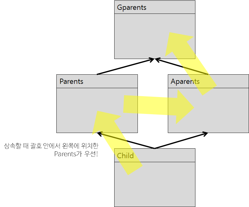 이러한 관계에서 Child의 부모 클래스가 뭐라고 말하긴 애매합니다. 이때 super는 정해진 순서에 따라 가장 가까운 부모나 친척 클래스를 탐방하게 됩니다. 위 상황은 코드로 옮겨봤습니다.