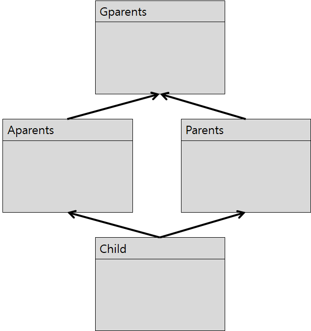 위의 결과에서 ch 객체를 기준으로 탐색을 하는데, 두번째 줄은 Parents라는 클래스형을 기준으로 탐색해서 super class를 탐색합니다. 그 결과 Gparents가 아닌 Aparents가 선택되었습니다. 그 다음 줄은 Aparents의 부모 클래스인 Gparents가 선택되었습니다. 이 선택의 기준에 대해서는 나중에 다시 이야기 해보겠습니다.