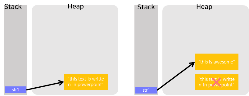 왼쪽은 str1이라는 String 변수가 Heap의 한 값을 참조하는 것을 보여줍니다. 그러나 str1의 값이 변경되면, 기존에 존재하던 문자열을 두고 새로운 값이 Heap에 할당되어 연결됩니다. 그러면 기존에 있던 문자열은 도달할 수 없게 되고, Garbage Collector가 실행되면서 이 값을 만나게 되면, 메모리에서 제거되는 것입니다.