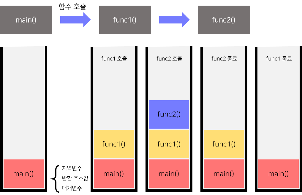 스택은 그냥 데이터를 쌓고 지우므로 빠르지만, 힙은 빈 공간이 있는지 확인하고 저장하기 때문에 속도가 느립니다. 대신 힙은 언제든지 데이터를 삭제하고 추가할 수 있습니다. 스택 영역이 stack 방식으로 데이터를 쌓는 이유를 이해하려면, 스택 프레임(Stack Frame)에 대해서 알아야 합니다. 이는 스택에 차곡차곡 저장되는 함수의 호출 정보를 나타냅니다. 아래는 스택 프레임의 작동 방식을 보여줍니다.