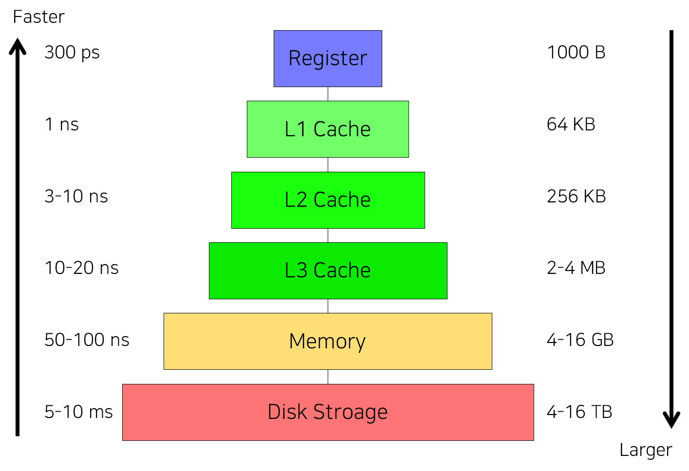 빠를 수록 작아지고, 느릴 수록 커지는 형태를 나타냅니다. 특별히 프로그램 실행 중에 주로 사용되는 공간은 레지스터부터 L1~L3(L4까지 있는 경우도 있습니다.) 캐시, 메모리 부분입니다. 일반적으로 메모리에 해당 내용이 저장되지만, 빠른 접근이 필요한 경우 캐시나 레지스터에 저장이 되고, 연산 과정 중이라면 레지스터로 그 값이 옮겨지게 됩니다.