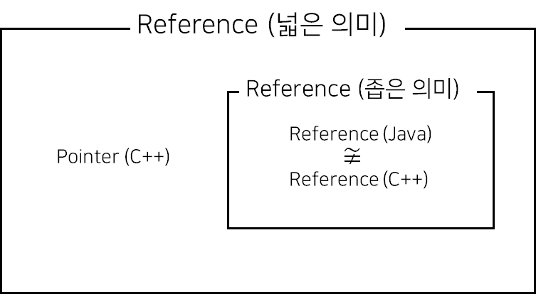 그런데, C++, Java에는 또다른 reference의 개념이 있습니다. 여기서 reference 개념은 보다 좁은 의미의 개념으로 볼 수 있습니다. 이러한 흐름을 요약해보자면 다음과 같이 그려볼 수 있겠습니다. (관련 내용은 이후 다른 글에서 다루어보겠습니다.)