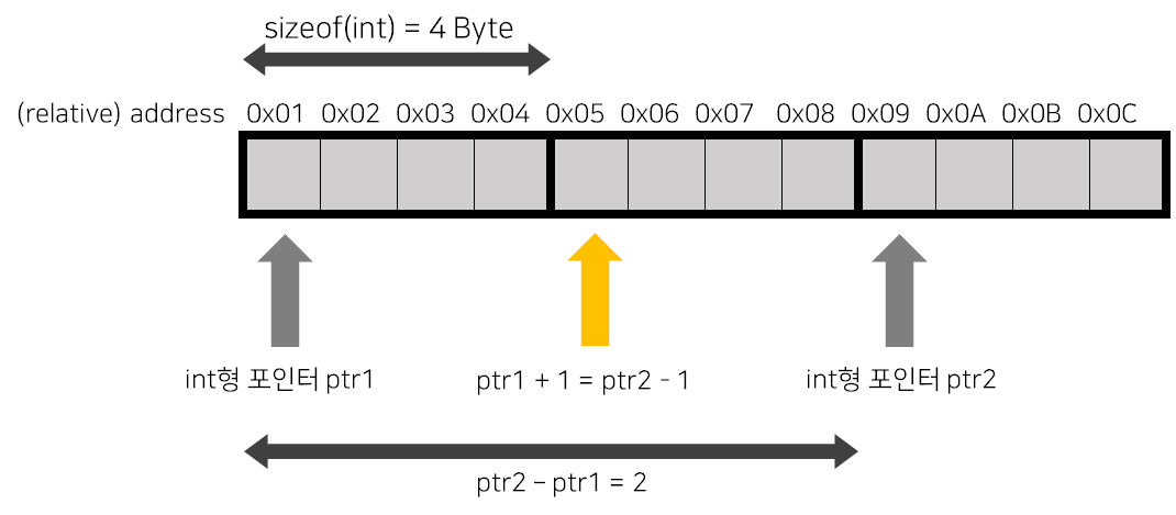 보다시피 빼는 경우 둘 사이의 주소상 거리를 나타내는 것이 아니라, 배열에서 거리처럼 T형 포인터는 sizeof(T)를 단위로 하여 측정된 주소상의 거리를 나타내게 됩니다. 포인터와 정수의 덧셈 또한 비슷한 규칙이 적용됩니다. 이 때 유의할 점은 포인터 사이 뺄셈의 결과는 포인터가 아니라 정수라는 점입니다.