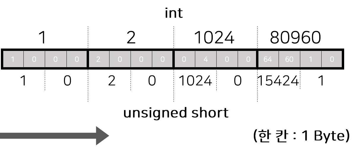 이렇게 방향을 반대로 생각하면 더 간편하게 이해할 수 있습니다. 이렇게 작은 단위가 주소가 낮은 쪽에 위치하는 방식을 '리틀 엔디안(Little-endian)'이라고 부릅니다. 이 방식은 우리가 읽는 방식과 반대되지만, 작은 단위쪽을 더 쉽게 접근할 수 있습니다. (배열을 생각하면, 배열명이 시작 주소이므로 별도의 덧셈 없이 바로 가장 작은 단위쪽의 수를 가져올 수 있습니다.)